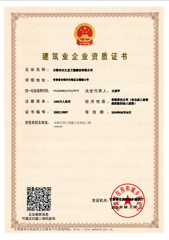 ???白銀市水之業(yè)工程建設(shè)有限公司成立于1988年7月,原名為白銀市市政工程管理處待業(yè)青年機(jī)械服務(wù)部,1990年3月10日辦理工商登記,注冊(cè)資金:壹仟萬(wàn)元整,類(lèi)型為有限責(zé)任公司(非自然人投資或控股的法人獨(dú)資)。公司的經(jīng)營(yíng)范圍:許可項(xiàng)目:建設(shè)工程施工;建設(shè)工程質(zhì)量檢測(cè);檢驗(yàn)檢測(cè)服務(wù);安全生產(chǎn)檢驗(yàn)檢測(cè);水利工程質(zhì)量檢測(cè);雷…